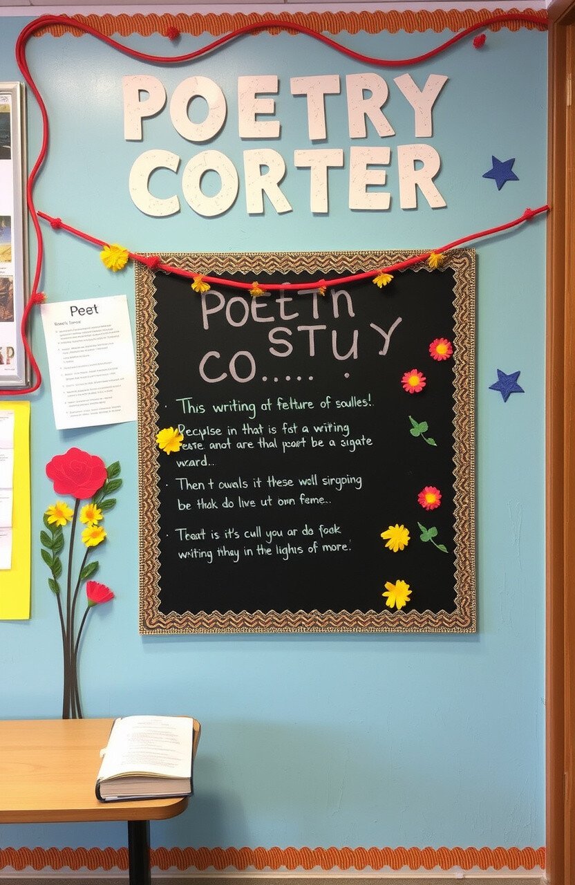 Celebrate creative writing with a poetry board displaying student-written work. Use themed decorations to set the mood.