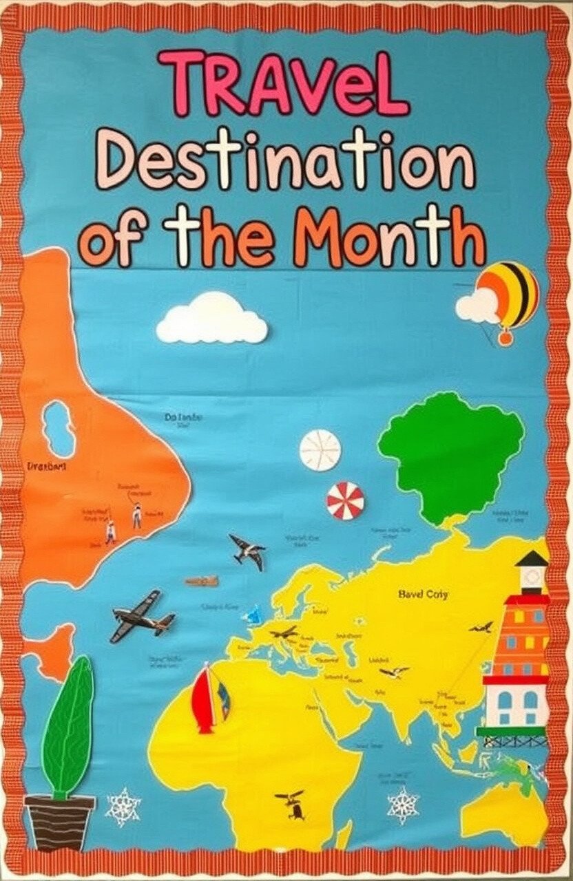 Feature a travel destination each month with visuals and fun facts. Use themed decor and colors to create excitement.