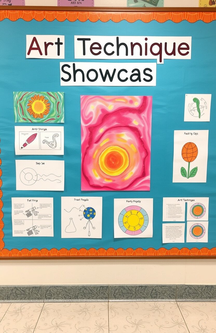Showcase different art techniques with student samples and step-by-step guides. Use vibrant colors and engaging visuals.
