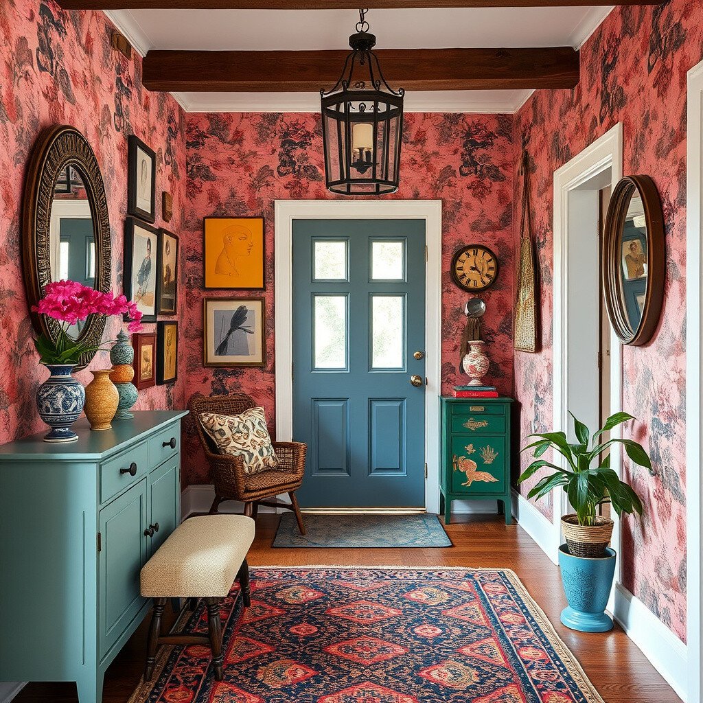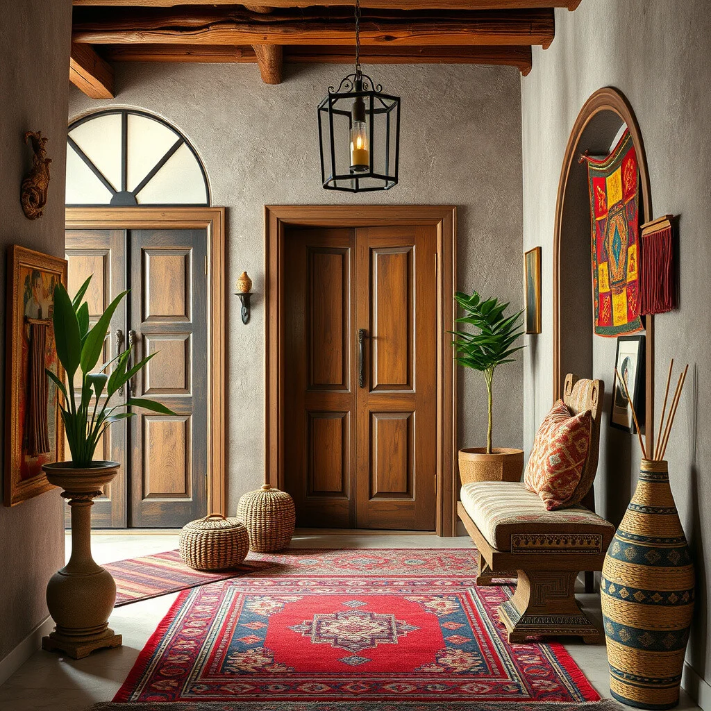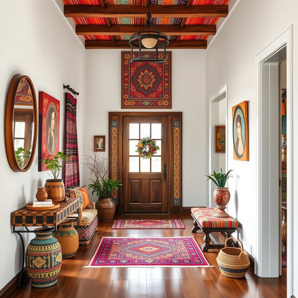 Imagine an entryway filled with colorful textiles and eclectic art. It’s like walking into a vibrant tapestry of culture.