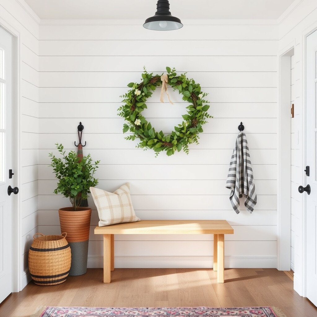 White shiplap walls and a welcoming wreath embody the farmhouse style. It’s like stepping into a country cottage.