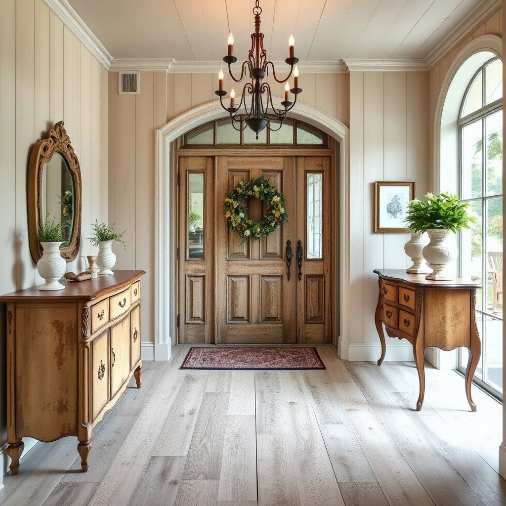 Imagine a foyer with distressed wood, soft colors, and elegant details. The French country style is all about rustic romance.