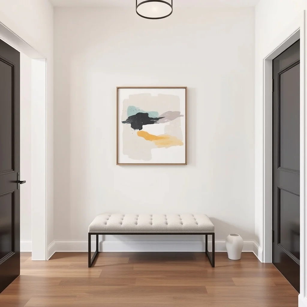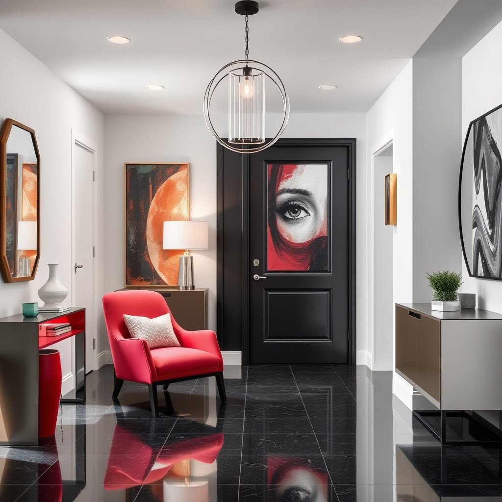 Sleek surfaces and modern art define the contemporary chic foyer. Picture minimalist furniture and bold accents.