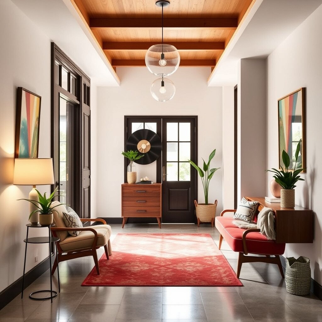 Retro vibes and clean lines define the mid-century modern foyer. Picture sleek furniture and iconic decor pieces.