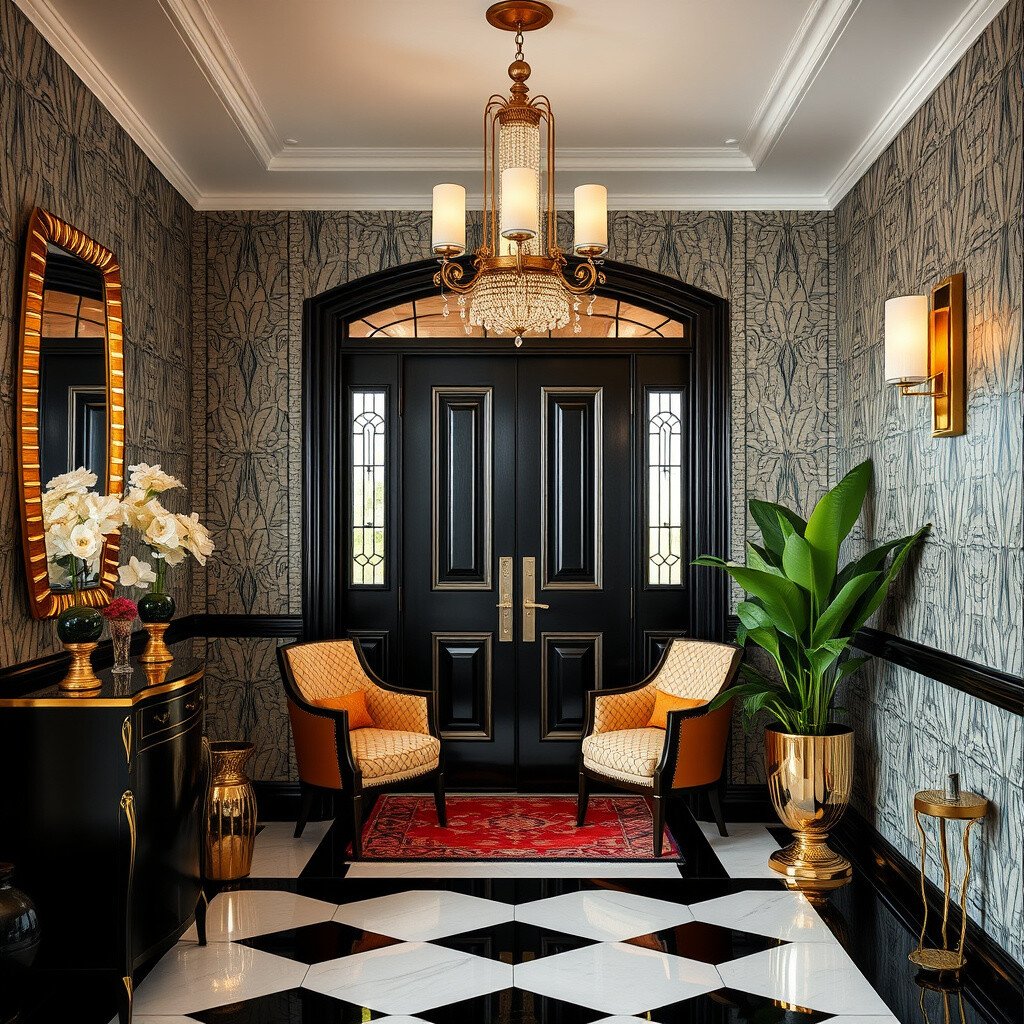 Glitz and glamour define the Art Deco foyer. Picture geometric patterns and metallic finishes creating a dazzling entrance.