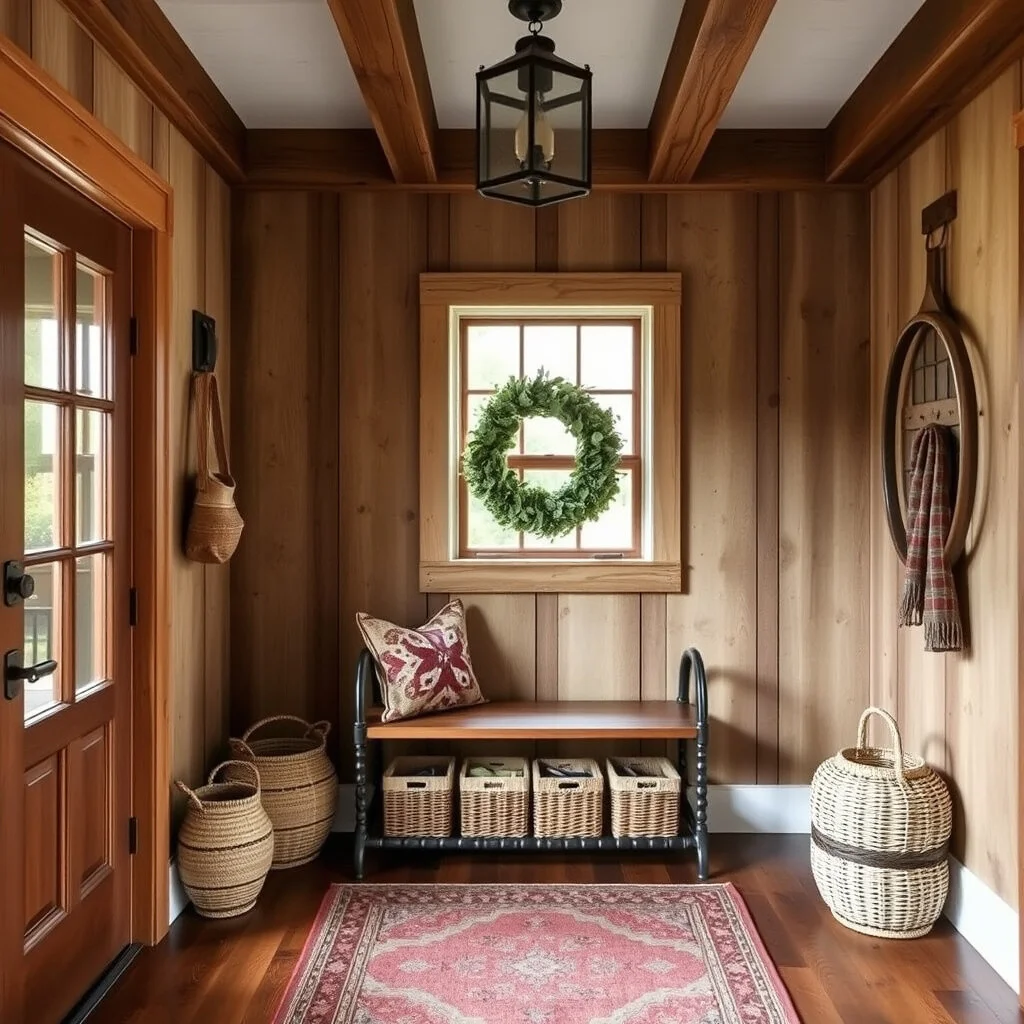 With wooden beams and vintage accents, the rustic entryway feels like a warm hug. Imagine stepping onto a wooden floor, with baskets and a cozy bench greeting you.