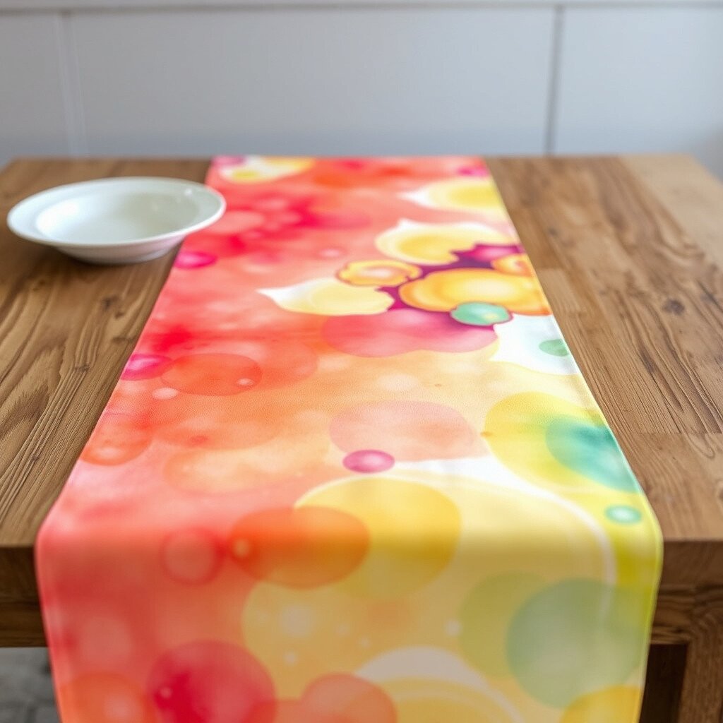 Create a watercolor effect on table runners using fabric dye. This technique involves blending colors for a soft, artistic look.