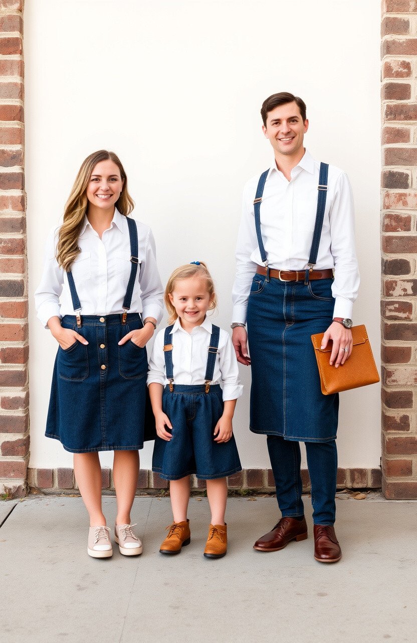 White button-down shirts paired with denim skirts create a clean and elegant look. This combo works for everyone in the family, from the little ones to the adults.