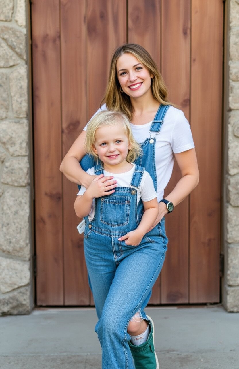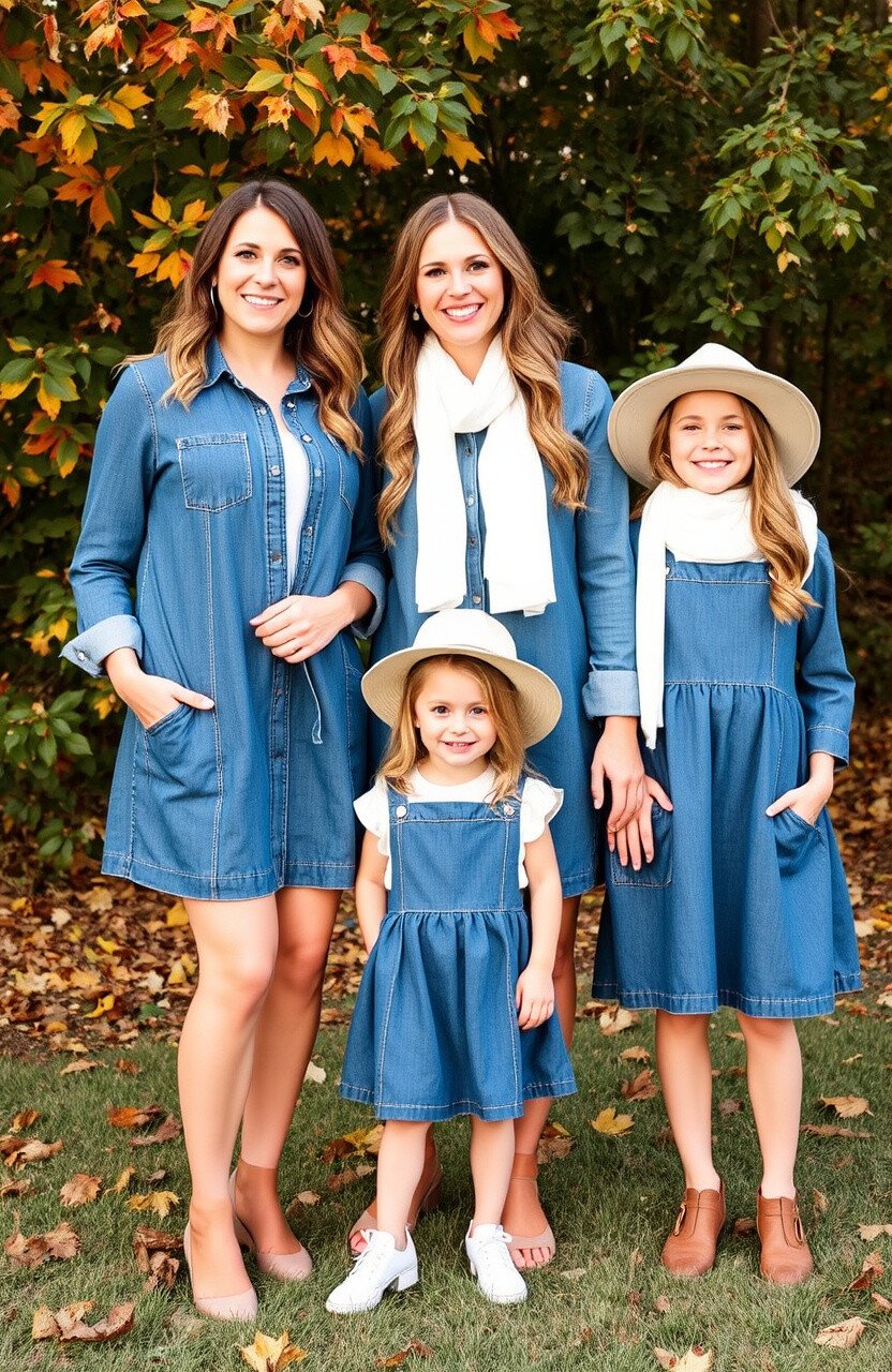 Denim dresses are both cute and versatile. Girls can wear denim pinafores with a white blouse underneath, while moms can opt for a denim shirtdress. Accessorize with white belts, scarves, or hats.