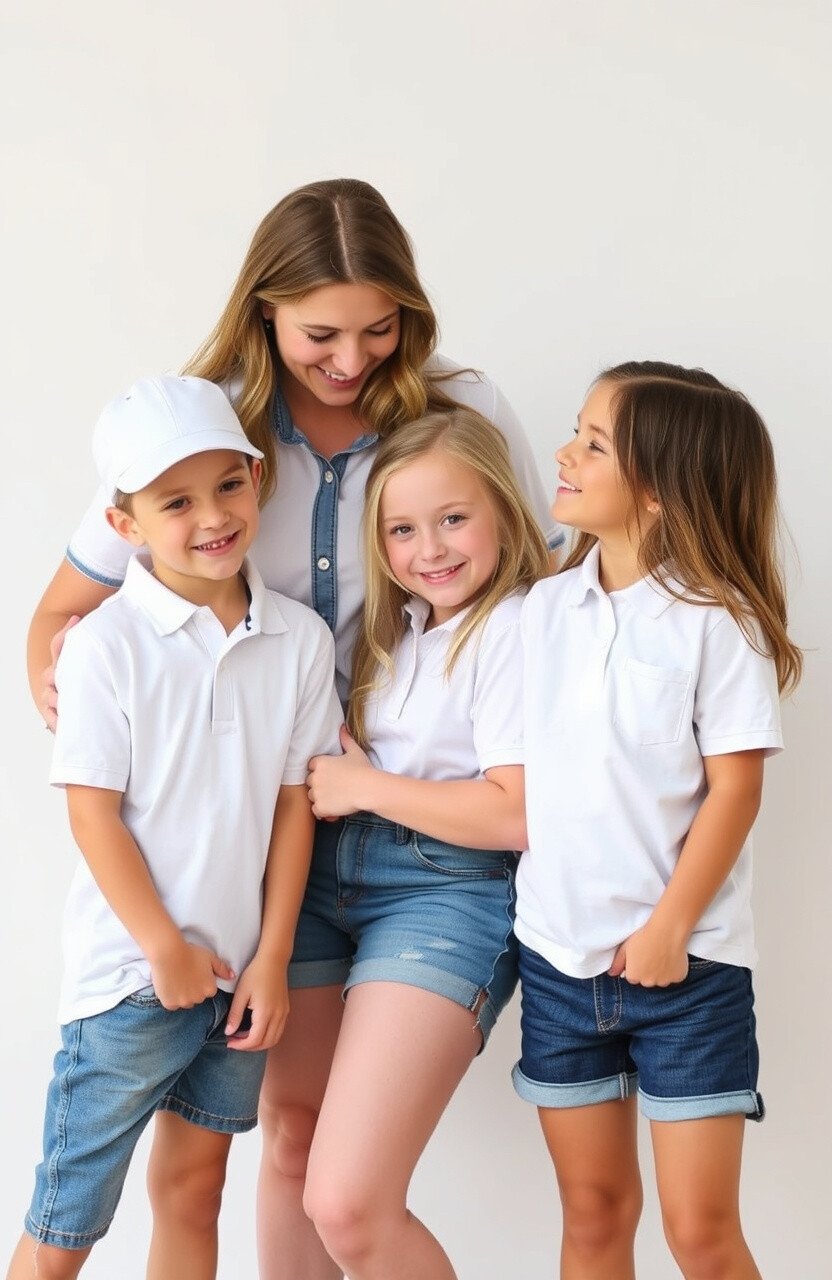 White polo shirts are a classic choice, and when paired with denim shorts, they create a relaxed and sporty look. This is perfect for families who love a casual vibe.