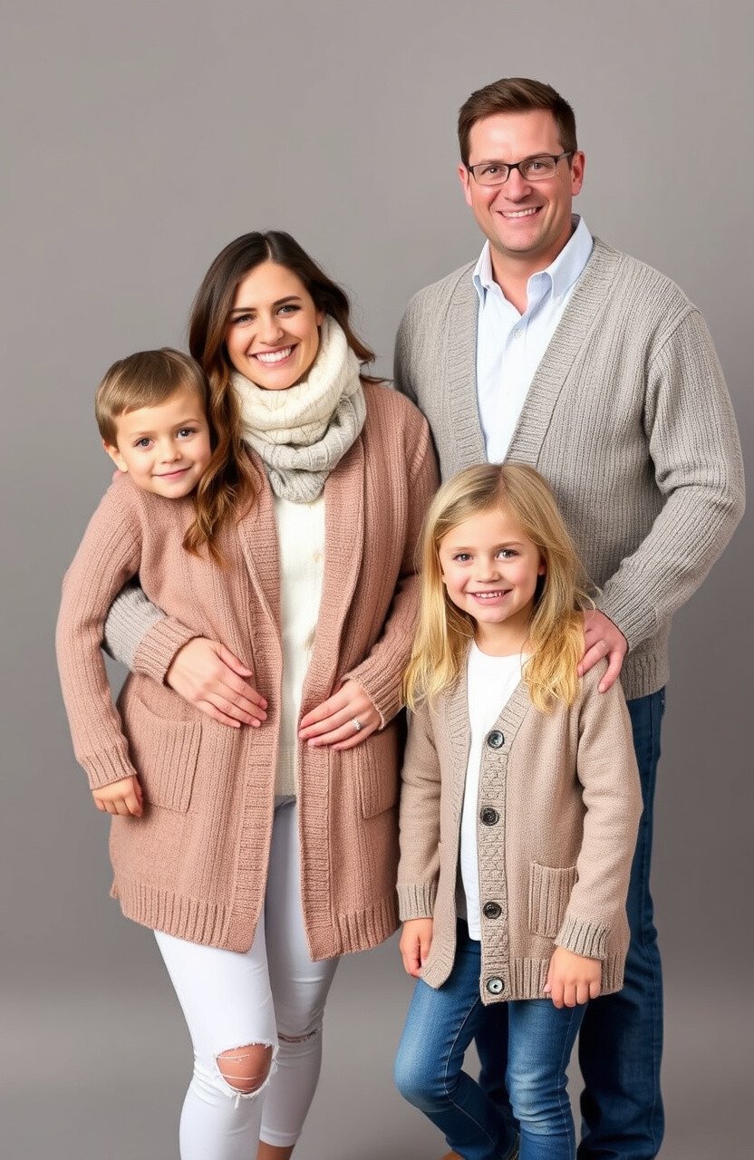Cardigans offer versatility and comfort, perfect for layering. Opt for matching cardigans in shades like taupe or heather gray for a cohesive family look.