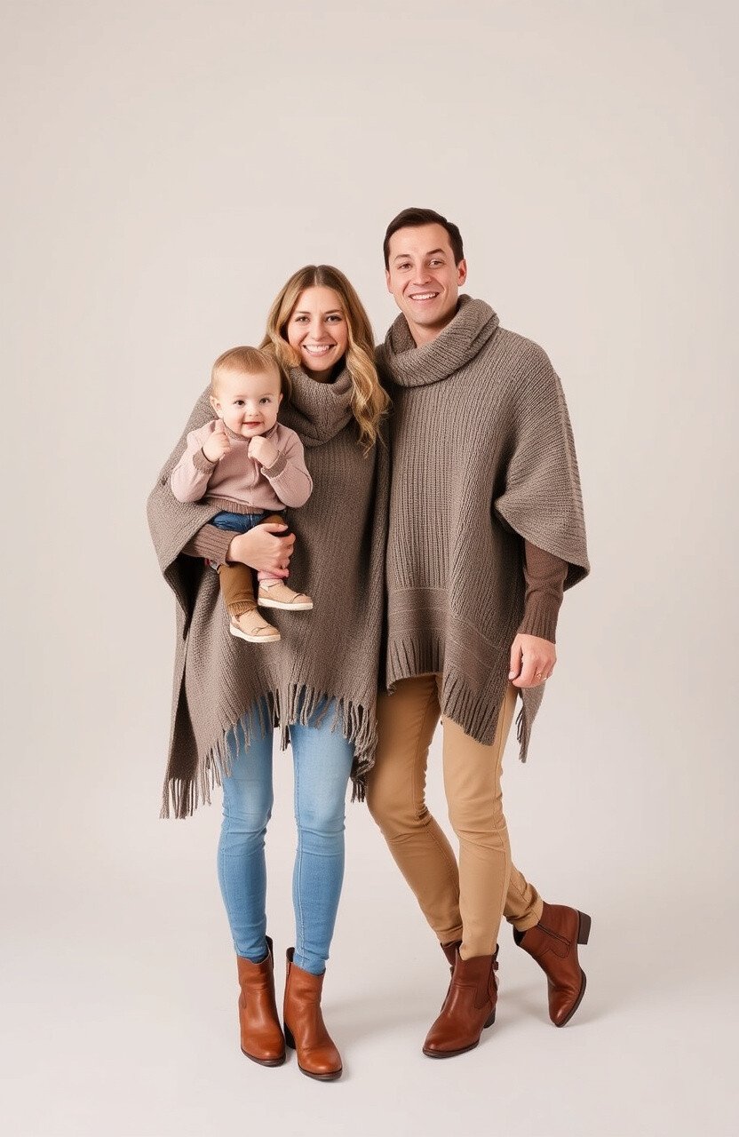 Select ponchos in soft grays or gentle browns. Their flowy design adds movement to photos, creating a dynamic and inviting look.