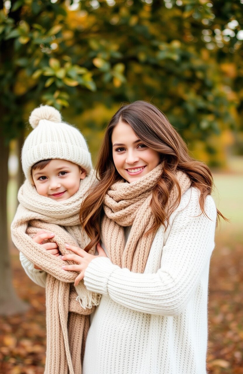 Choose sweaters in soft shades of beige or cream for a timeless look. These hues blend beautifully with autumn colors, enhancing the natural backdrop.