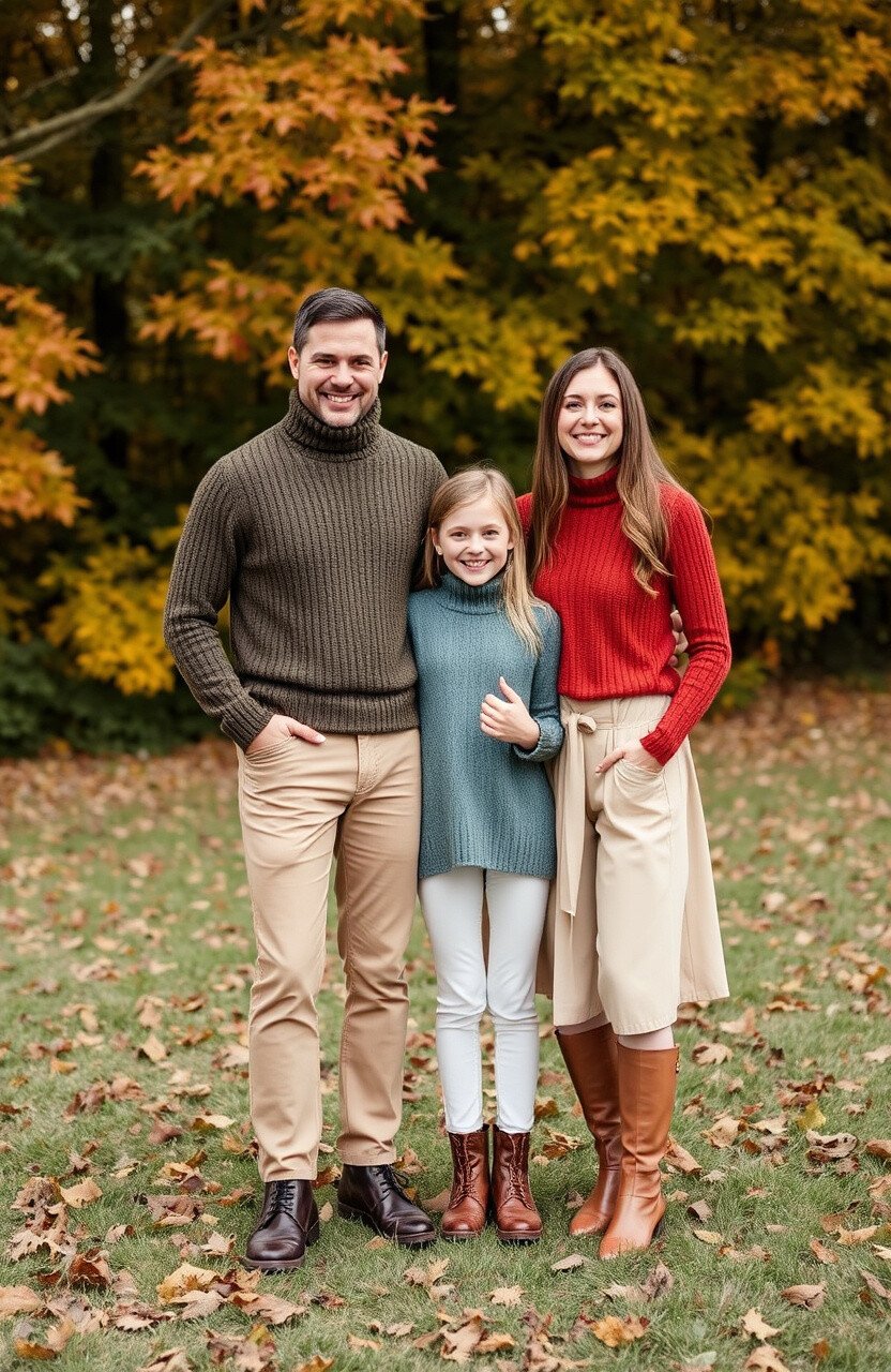 Cable knit sweaters are a classic choice for fall, offering warmth and style. Their textured patterns add a charming detail to family photos, making each member look snug and stylish.