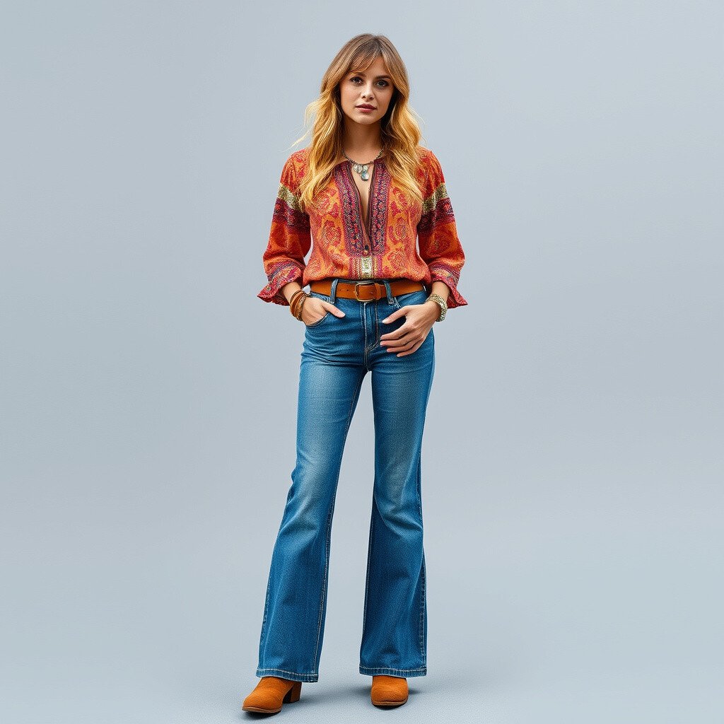 Accessorize with a leather belt and some suede boots to enhance the retro vibe. Try adding a chunky necklace or some bangles for a personalized touch. You can easily find flared jeans and peasant blouses at thrift stores or vintage shops at an affordable price.