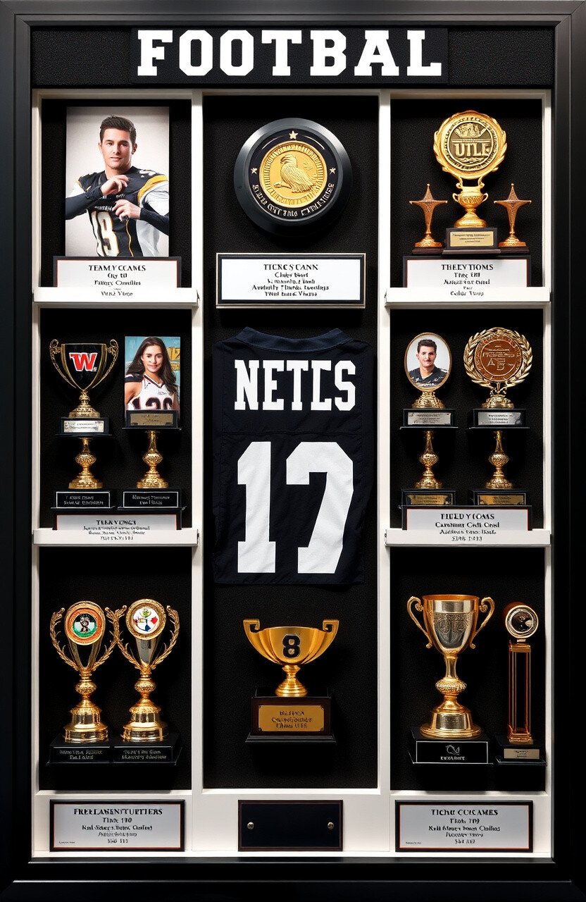 Showcase your football accolades, from MVP titles to team trophies. Use photos or replicas to highlight your success.