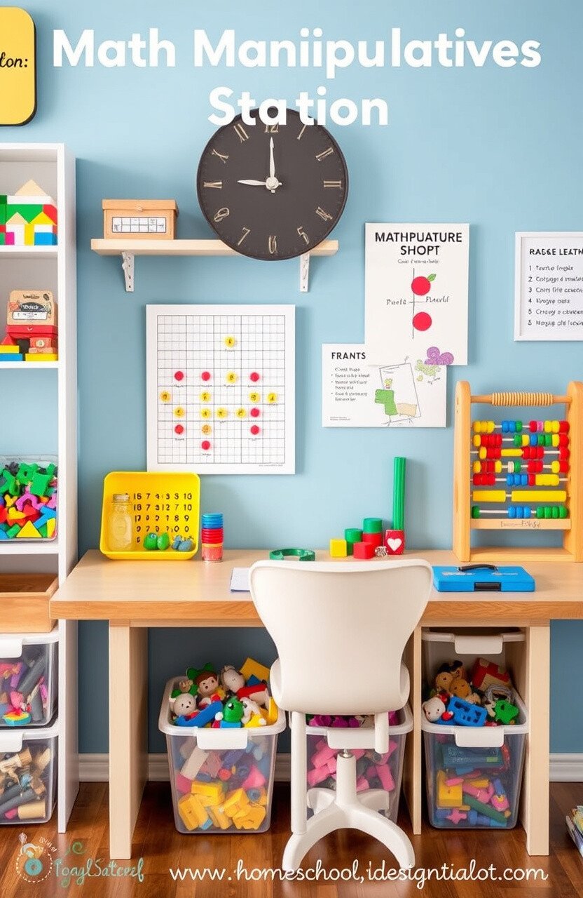 A dedicated station for math manipulatives enhances understanding. Include blocks, counters, and abacuses.