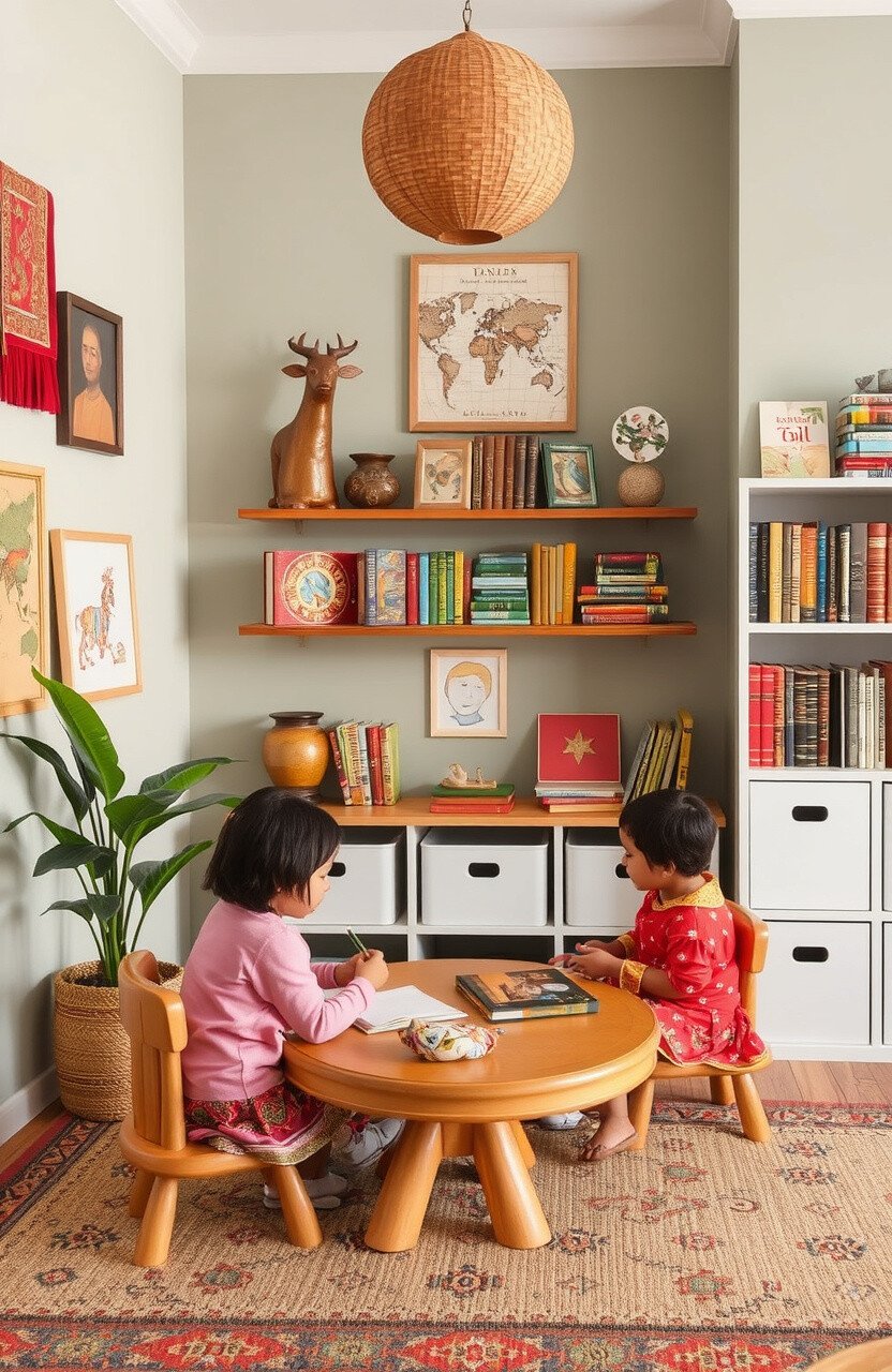 Set up a zone for cultural exploration with books and artifacts. Include music, art, and traditional crafts.