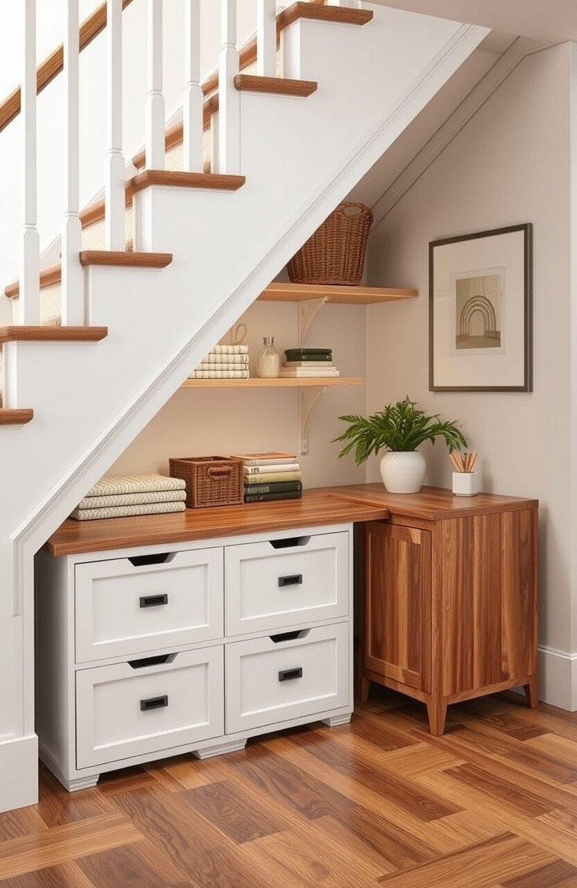 Turn that unused space under the stairs into something amazing. Think drawers, shelves, or even a mini office.