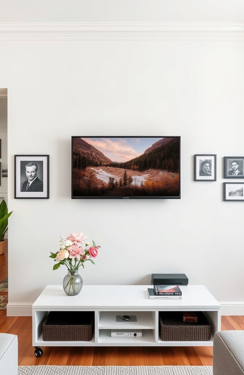 Choose a mount that fits your TV size. Personalize with a gallery wall around it.