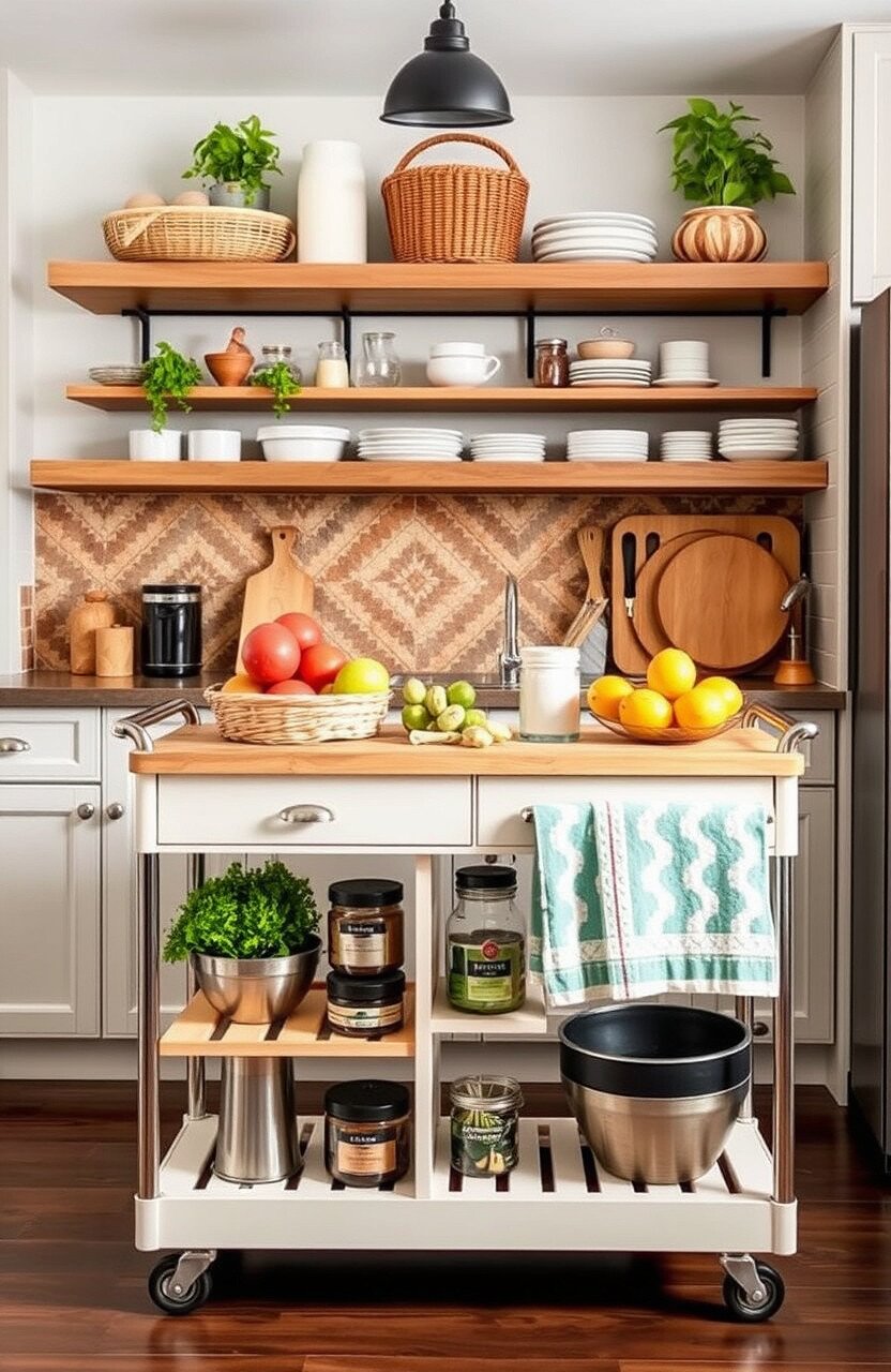A rolling cart adds extra storage and prep space. It’s mobile and versatile.