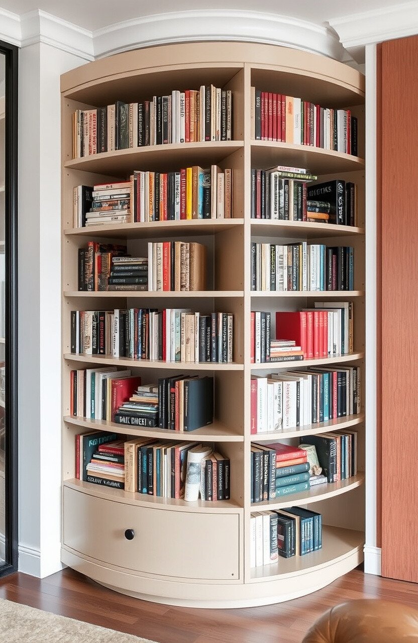 A rotating bookcase adds a unique twist to storage. Ideal for book lovers with limited space.