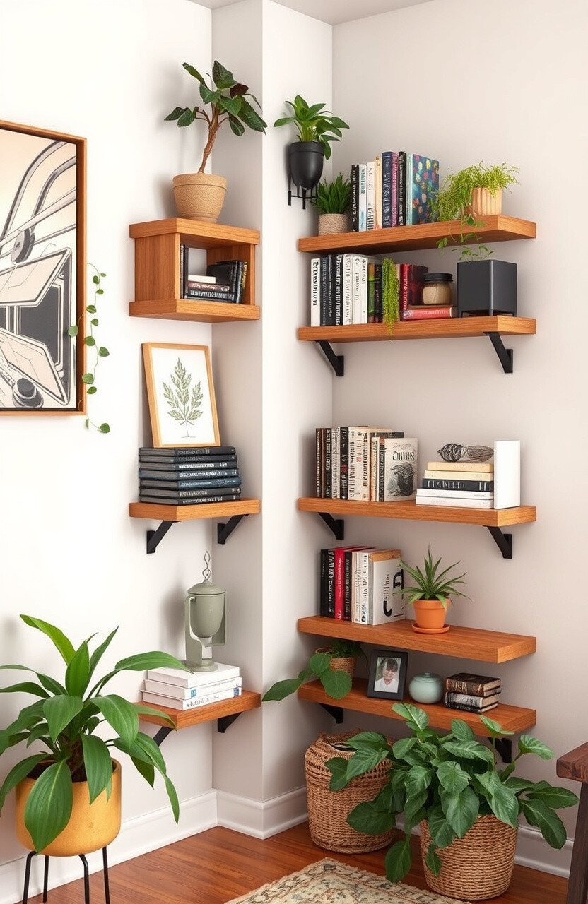 Install floating shelves for books and decor. Perfect for living rooms or bedrooms.