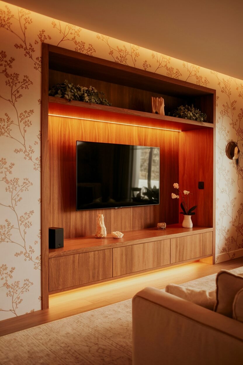 Creating a stylish accent wall behind your TV can add depth and character. Use paint, wallpaper, or wood panels to make a striking statement.