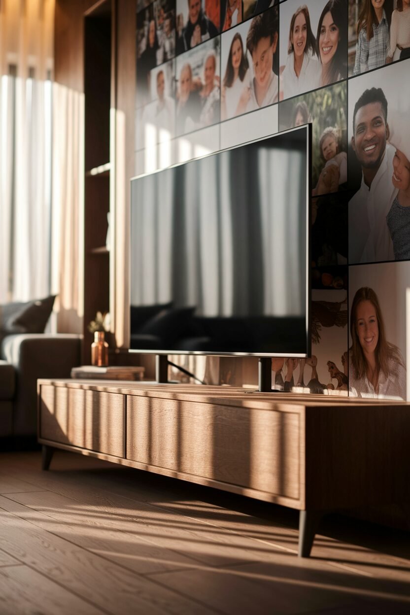 A personalized photo collage can bring warmth and charm to your TV area. Choose favorite photos that tell your story and display them around your TV.