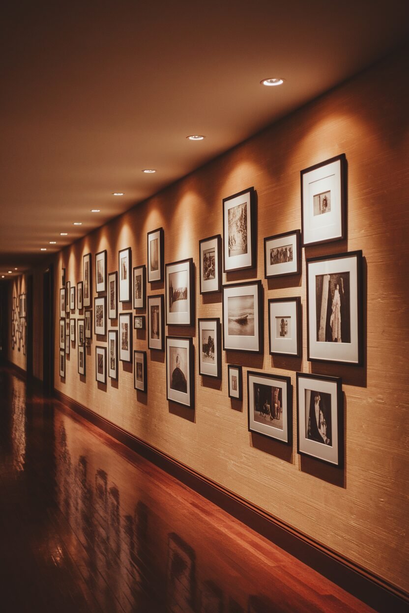 A photo gallery in your hallway turns it into a storytelling space filled with memories and moments that are special to you. This idea allows you to showcase family photos, travel adventures, or any cherished experiences in frames of different sizes and styles.