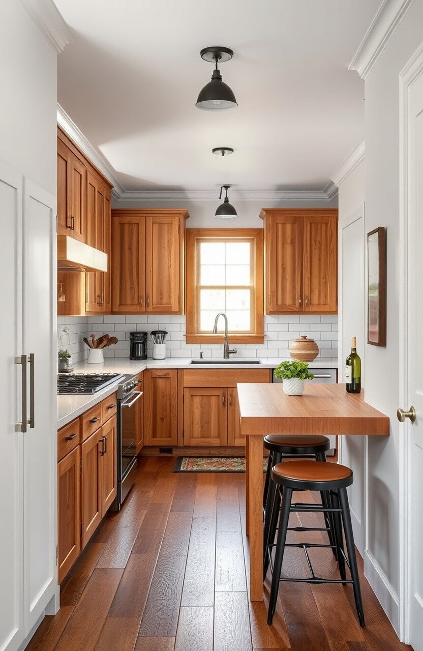 Wooden cabinets and a butcher block island bring a cozy, rustic feel. But add a twist with modern bar stools or industrial lighting.