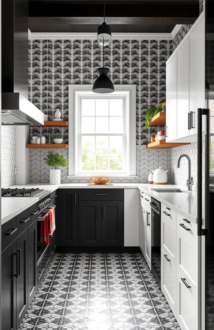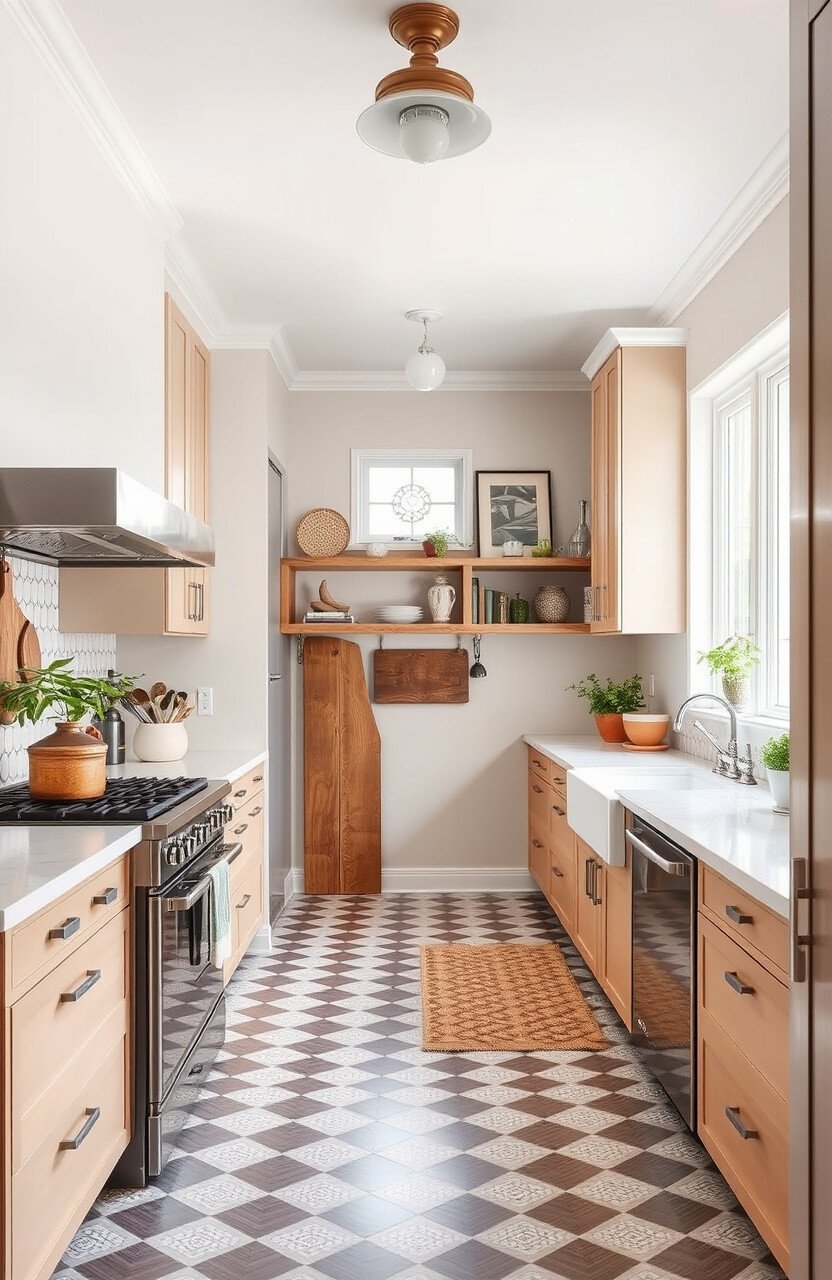 A galley kitchen with bold patterns and textures can make a big impact. Think geometric tiles and textured finishes.