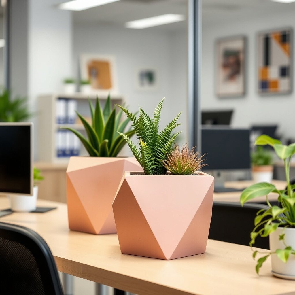 Plants in geometric planters can refresh any office. Think hexagons or triangles.