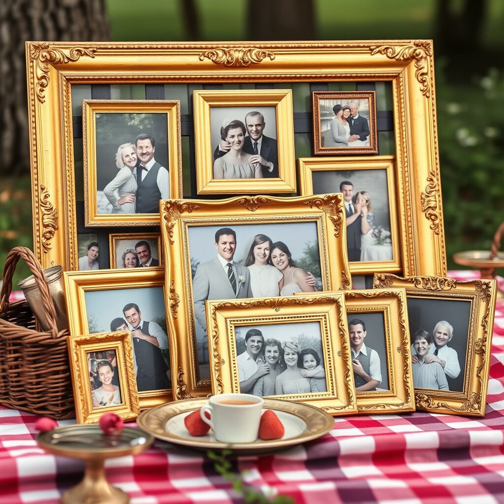 Use old gold frames to display cherished photos from your journey together. Scatter them across the picnic area to create a nostalgic gallery. It’s like walking down memory lane with each glance.