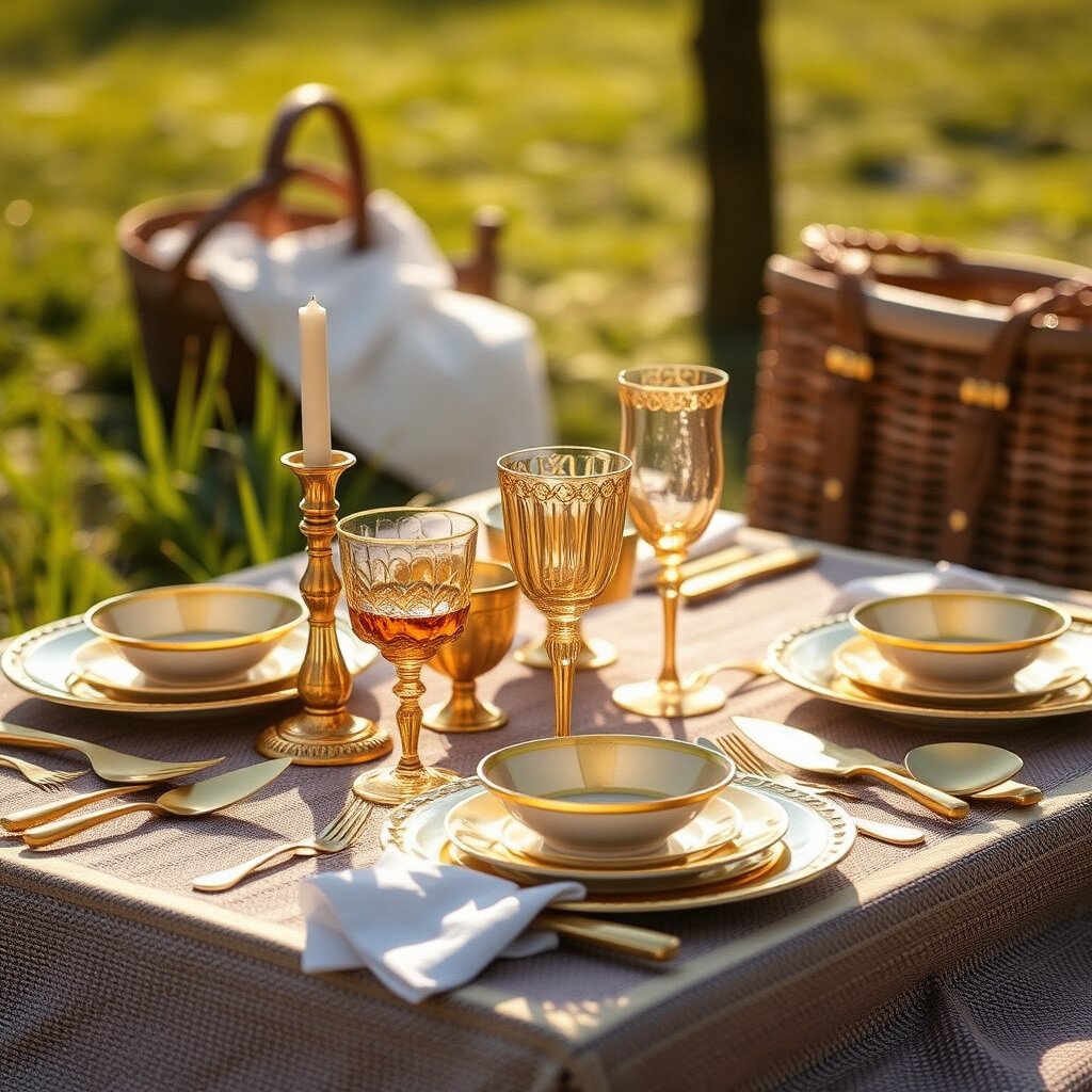Picture a picnic spread with golden cutlery and vintage plates that look like they belong in a fairy tale. Using gold-rimmed glasses and ornate serving utensils adds a touch of sophistication. You could source these from antique stores or online shops, making your picnic feel both luxurious and personal.
