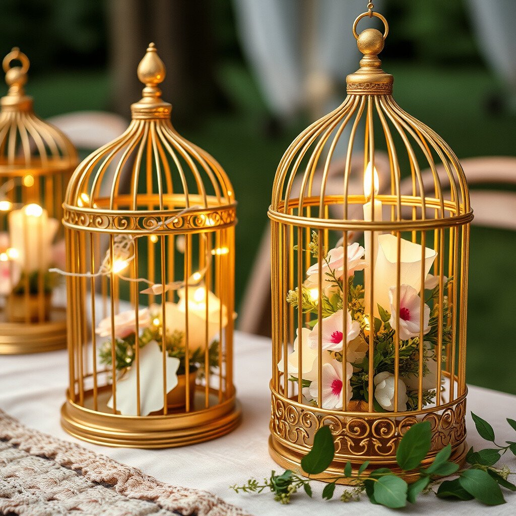 Use golden birdcages as decorative pieces. Fill them with flowers, fairy lights, or even little notes from guests. They add a whimsical touch to the vintage theme.