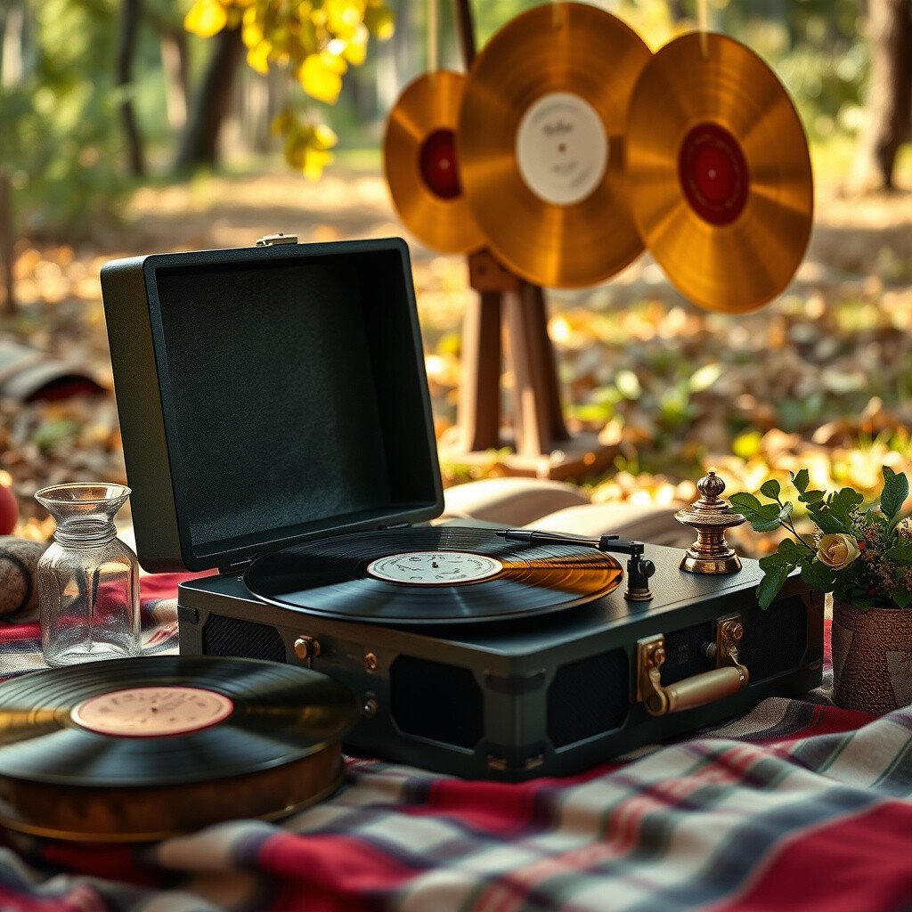 Play some tunes on a vintage record player, using golden vinyl records as part of the decoration. The soft music and vintage sound will set a nostalgic tone. Hang records from trees or use them as placemats for a unique touch.