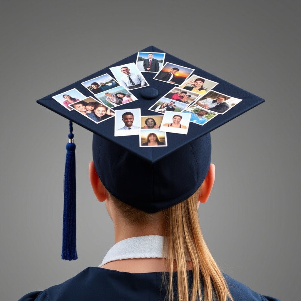 Create a mini scrapbook on your cap with small photos. Use memories from school, family, and friends for a personal touch.