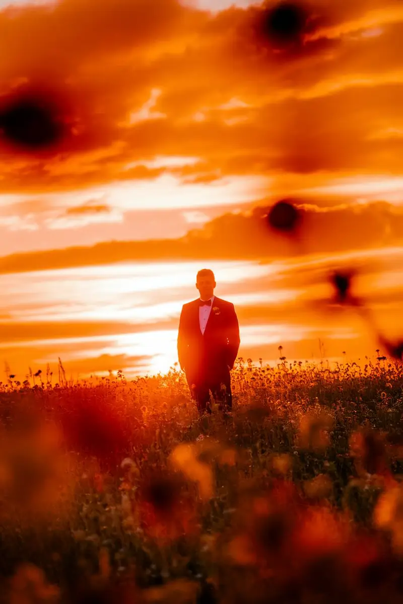 Visualize the groom’s silhouette against a stunning backdrop. This pose is dramatic and artistic.