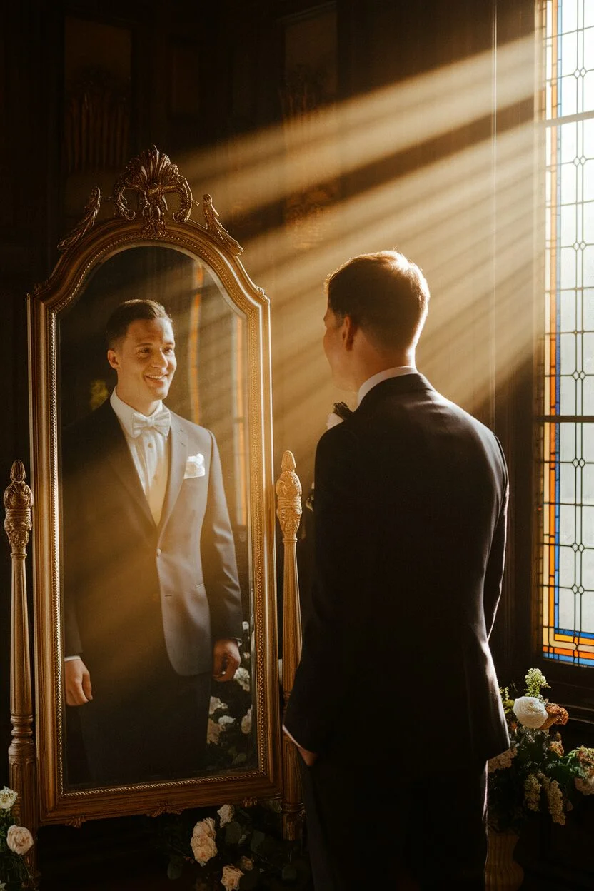 Use a vintage or ornate mirror for added elegance. It’s a glimpse into the groom’s personal moment.