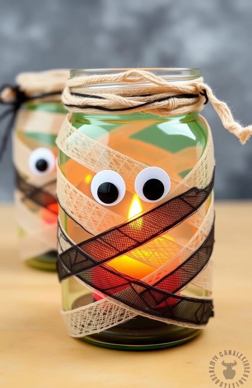 Wrap mason jars with gauze to create mummy candle holders. Add googly eyes for a playful twist.