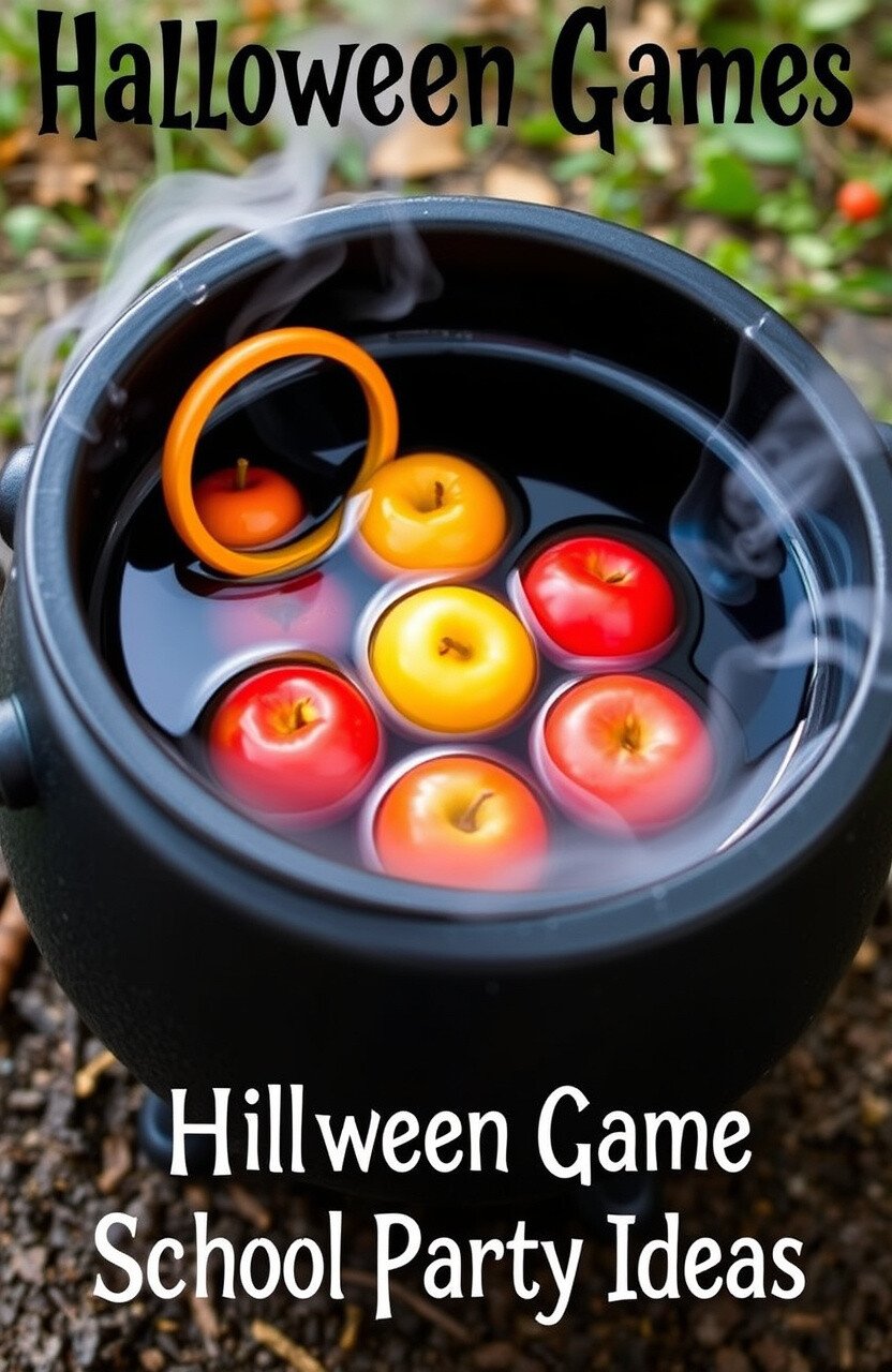 Fill a large cauldron with water and floating apples or balls. Kids toss rings or small bean bags to land in the cauldron.
