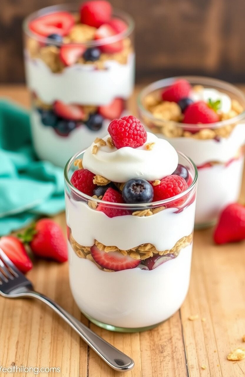 Greek yogurt parfaits are like a dessert that’s good for you. Layered with granola and berries, they’re a creamy delight.