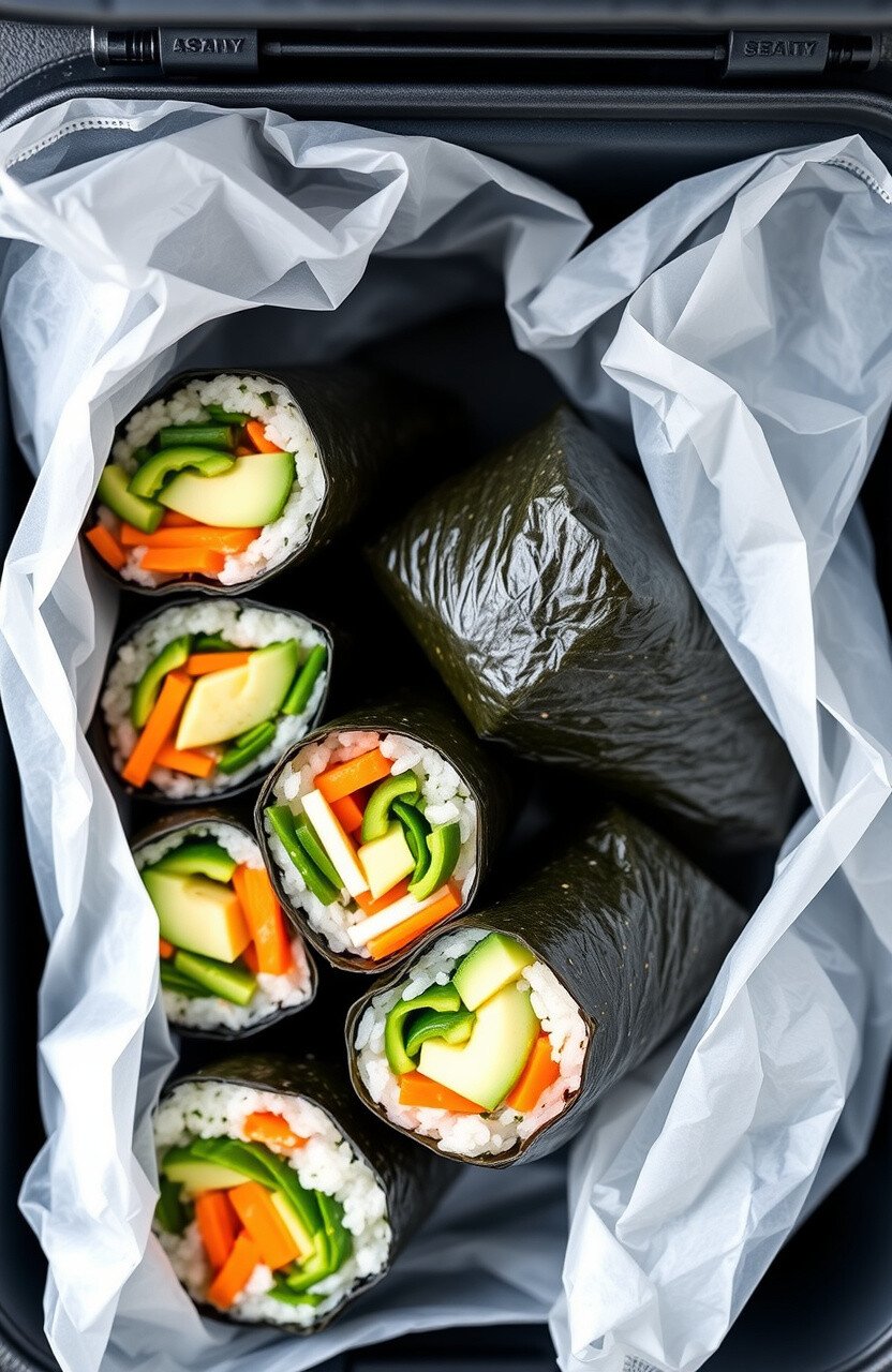Veggie sushi rolls are like a sushi bar in your cooler! Filled with cucumber, avocado, and carrots, wrapped in seaweed and rice.