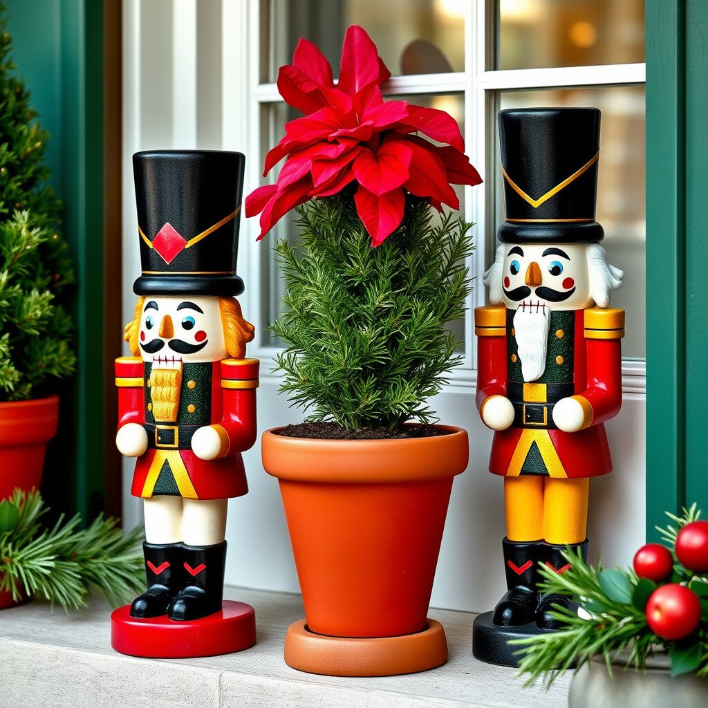 Paint terra cotta pots to resemble nutcrackers, complete with bright uniforms and bold faces. Plant small evergreens or poinsettias inside.