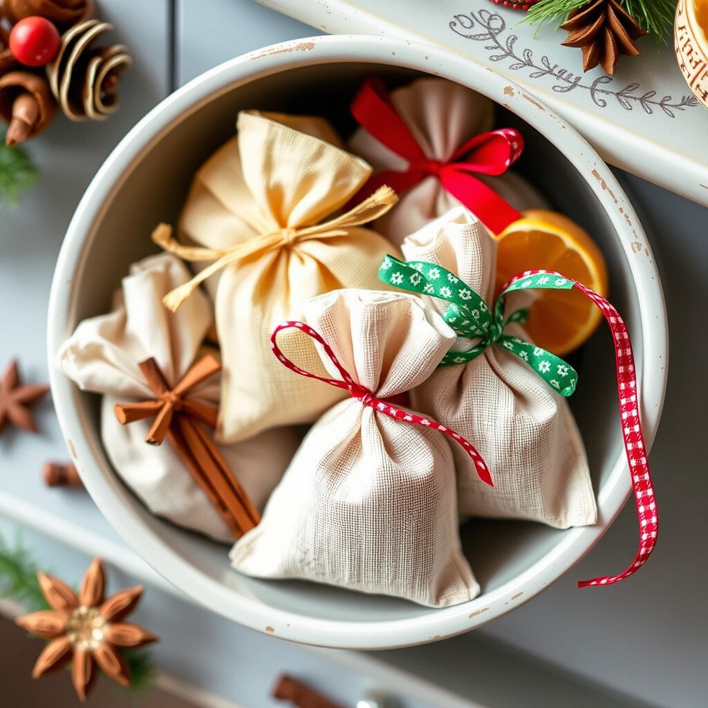 Fill small fabric bags with dried herbs and spices like cinnamon, cloves, and orange peel. Tie them with festive ribbon for a pretty finish.