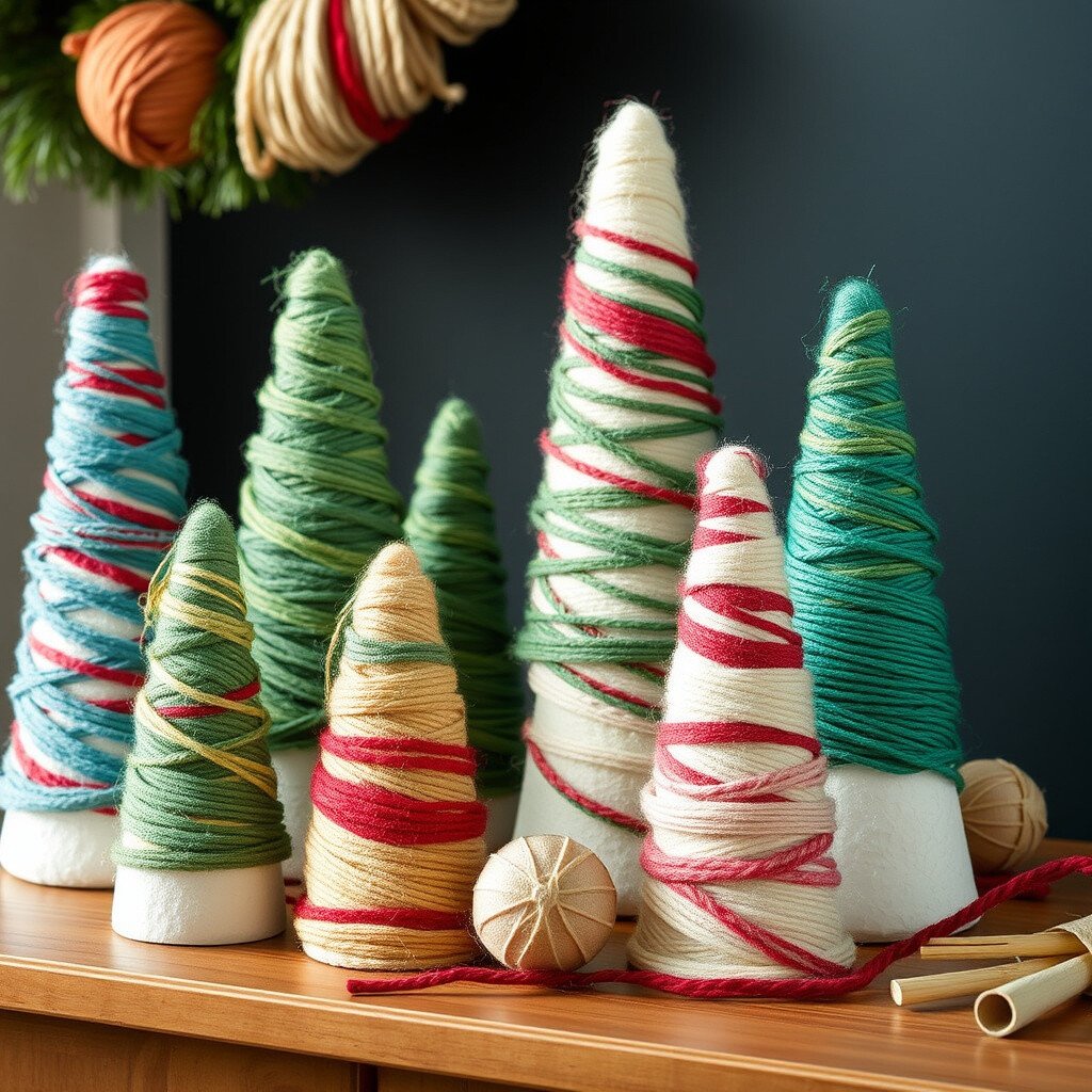 Create a cozy forest of yarn-wrapped trees that add texture and warmth to your holiday setup.