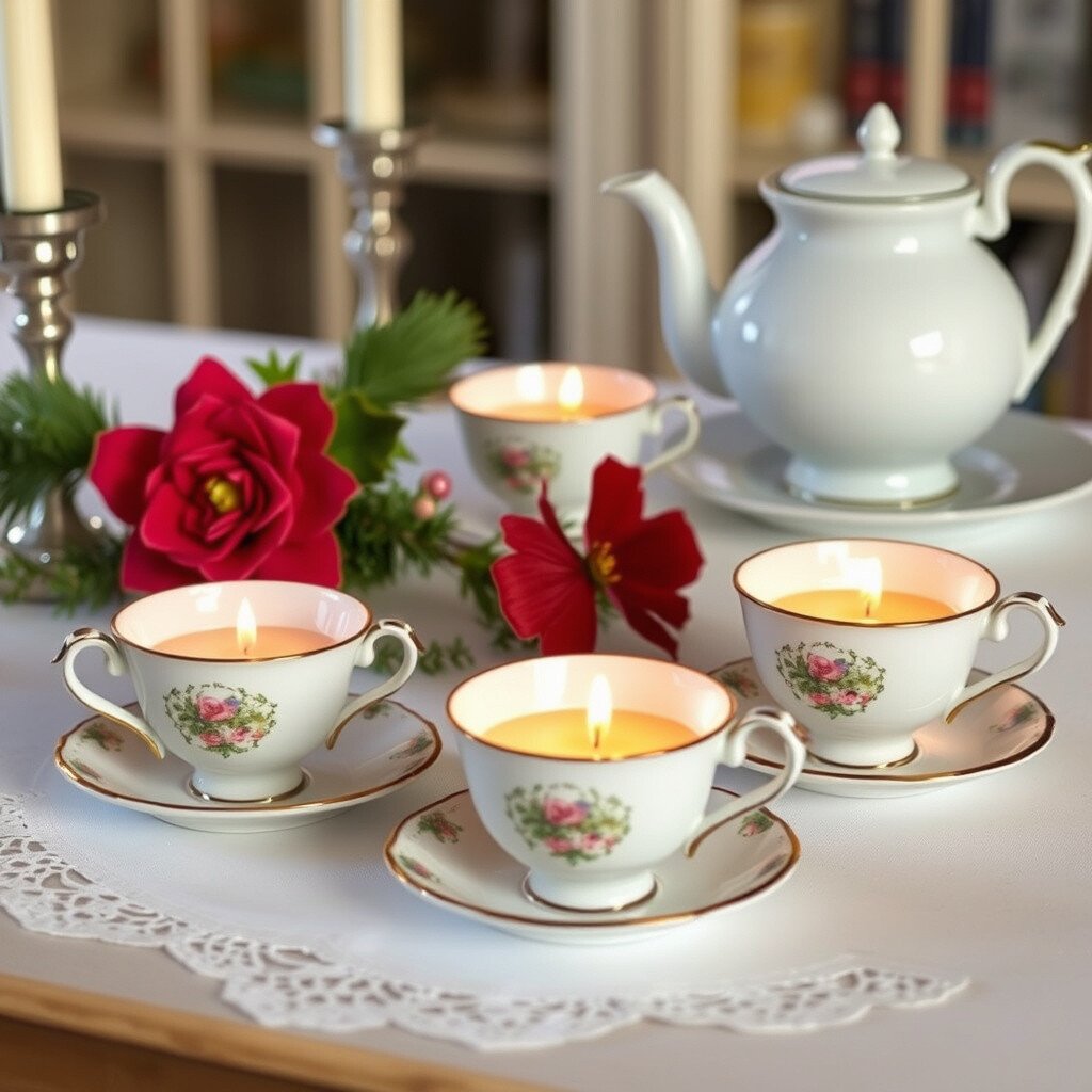 Add elegance to your holiday table with vintage teacup candles that offer a soft, romantic glow.