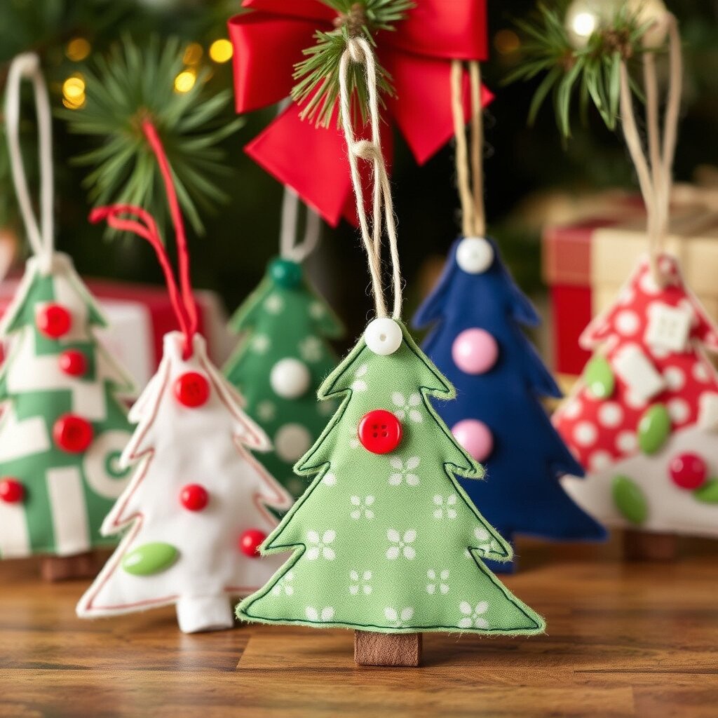Cut the scraps into tree shapes, and sew or glue them together. Add a loop for hanging, and decorate with buttons or beads.
