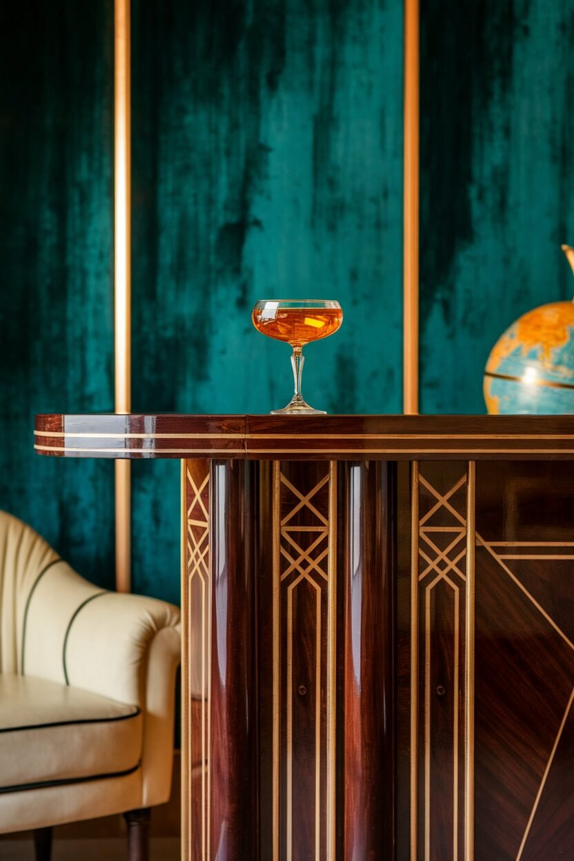 Imagine a bar that sparkles with geometric patterns, bold colors, and luxurious materials. This style brings the glitz and glamour of the 1920s to life.